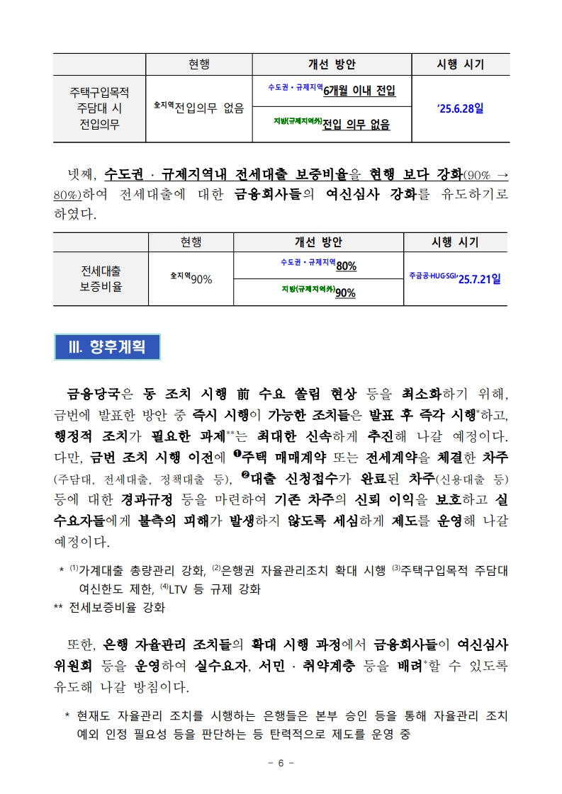 | 전세대출 | - 조건부 전세대출(갭투자): 금지 - 보증비율: 90% → 80% (수도권·규제지역) | 2025.7.21부터 |