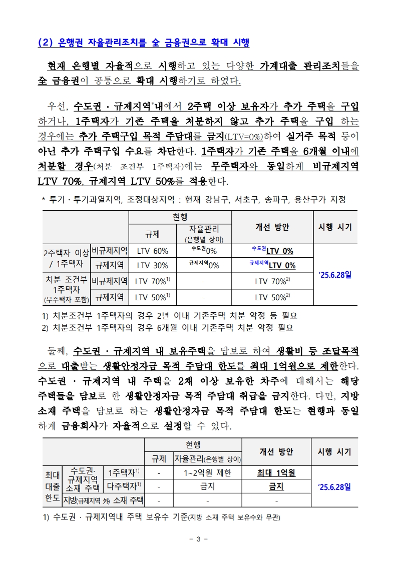 | 2주택 이상 | 주택 추가 구입 | - 수도권·규제지역: 주담대 원천 금지 (LTV = 0%) | 갭투자 차단 목적 |