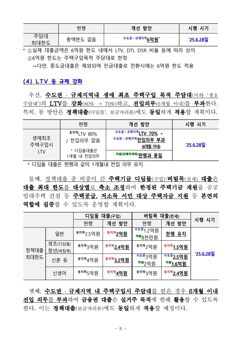 | 무주택자 | 주택 구입 | - LTV 최대 70% (규제지역) - 생애최초 구입시 6개월 내 전입 의무 - 주담대 최대 6억원 | 기존 80% → 70% 축소 |