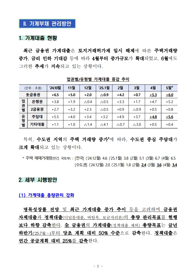 | 신용대출 | - 한도: 연소득 이내로 제한 | 주택구입 차단 목적 |