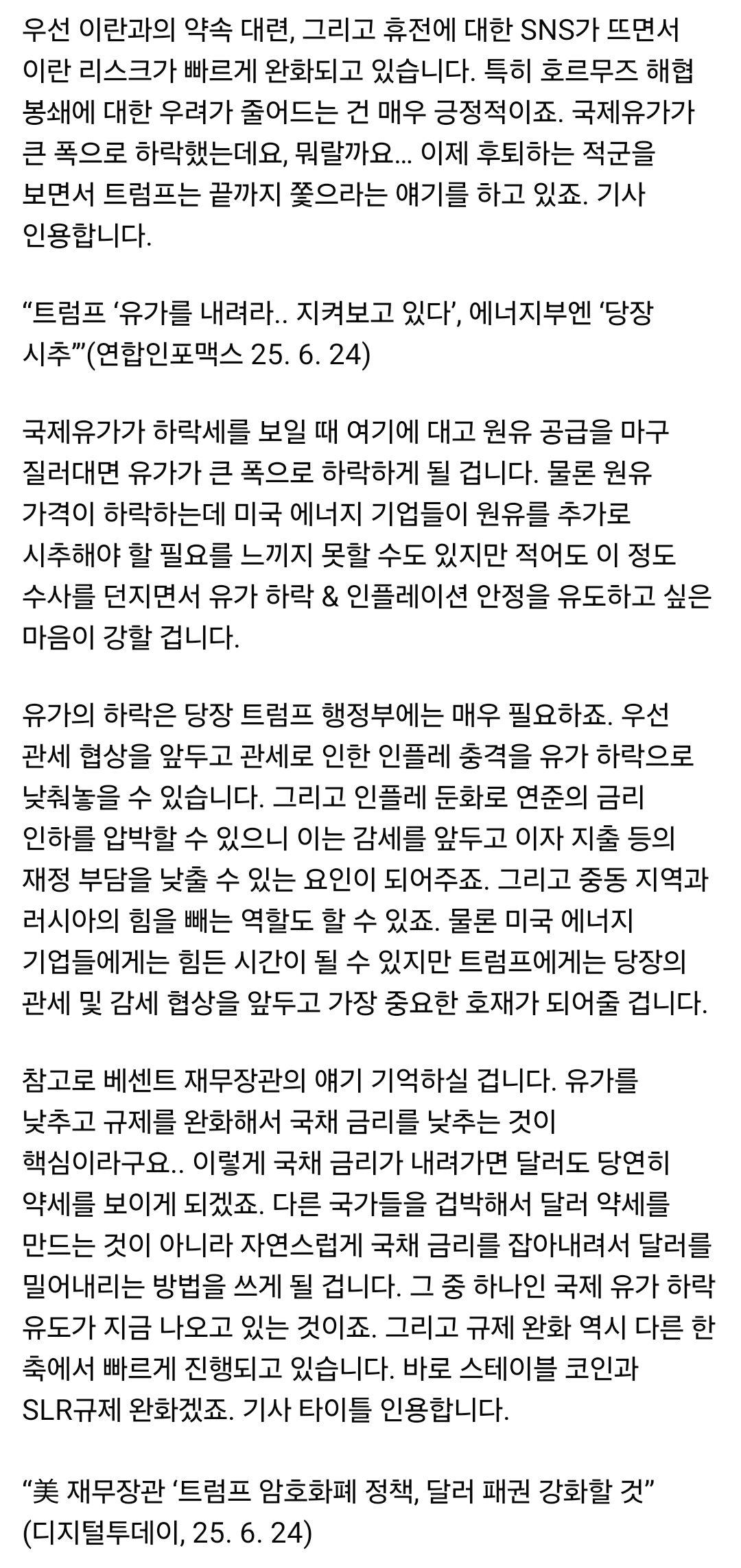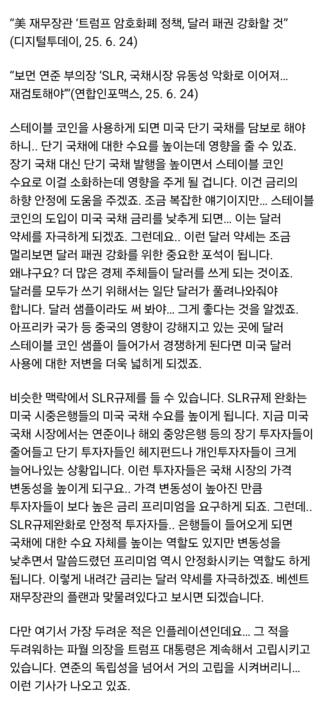 트럼프는 이란과의 휴전을통해 유가를 낮추고 스테이블 코인 과 SLR!규제 완화를 통해 금리인하를 하고자합니다