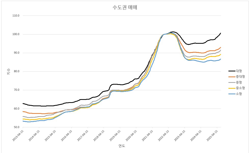 두번째로 15~17년, 21~22년에 소형, 중소형 의 매매 상승률이 높습니다.