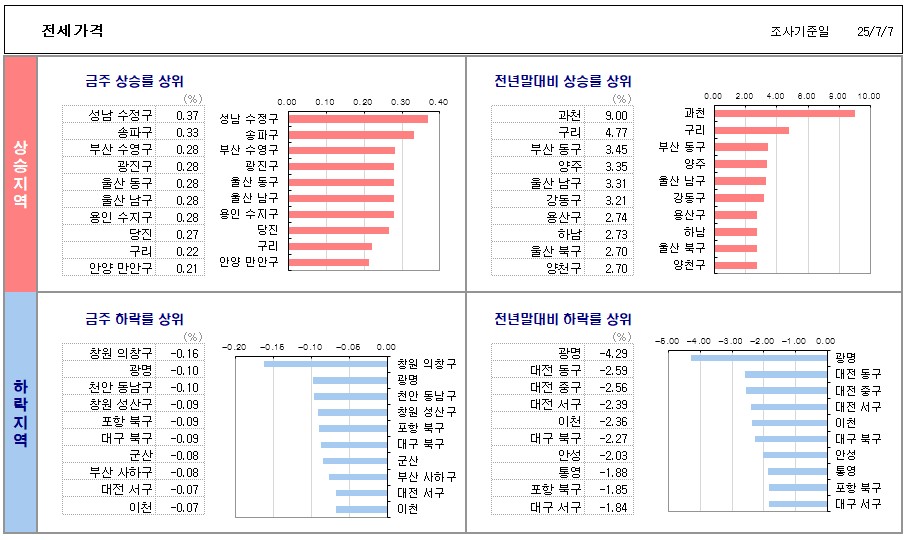 반면 전세가는 수영구, 울산 등이 상승에 랭크되어 있는게 보이네요