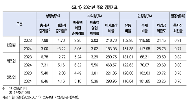 - 제조업은 2024년 총자산증가율이 7.31%, 매출액증가율이 5.16%로 전년 대비 각각 0.53%p, 7.88%p 상승함. 전산업 및 제조업의 성장성 개선과 달리, 건설업의 성장성지표는 전년 대비 악화함.